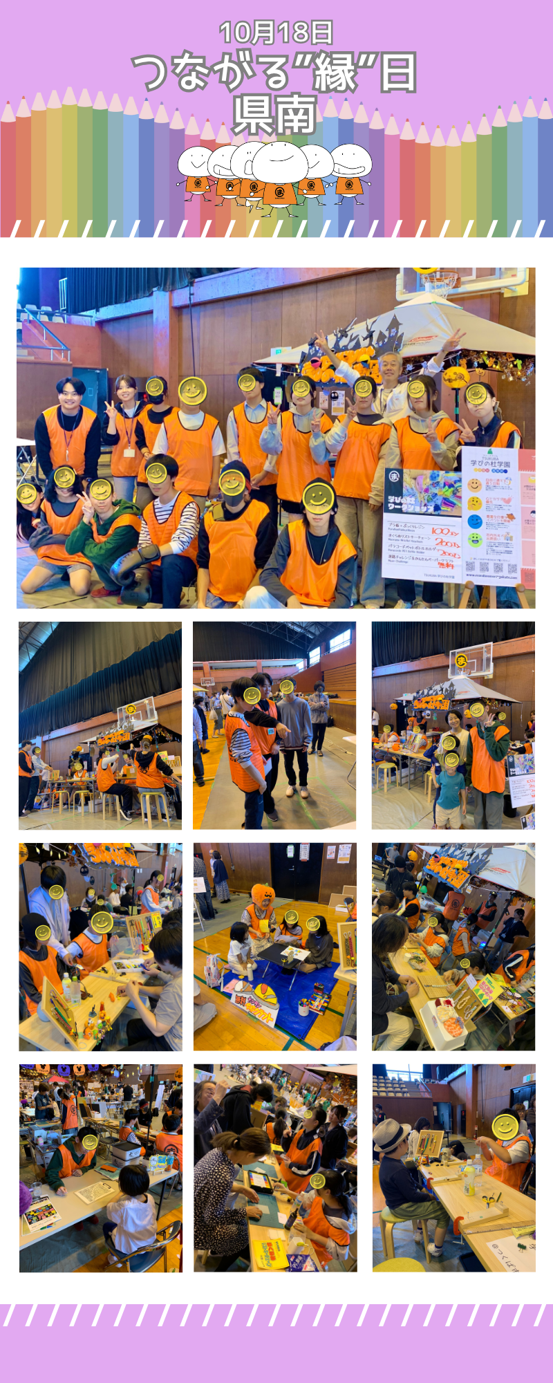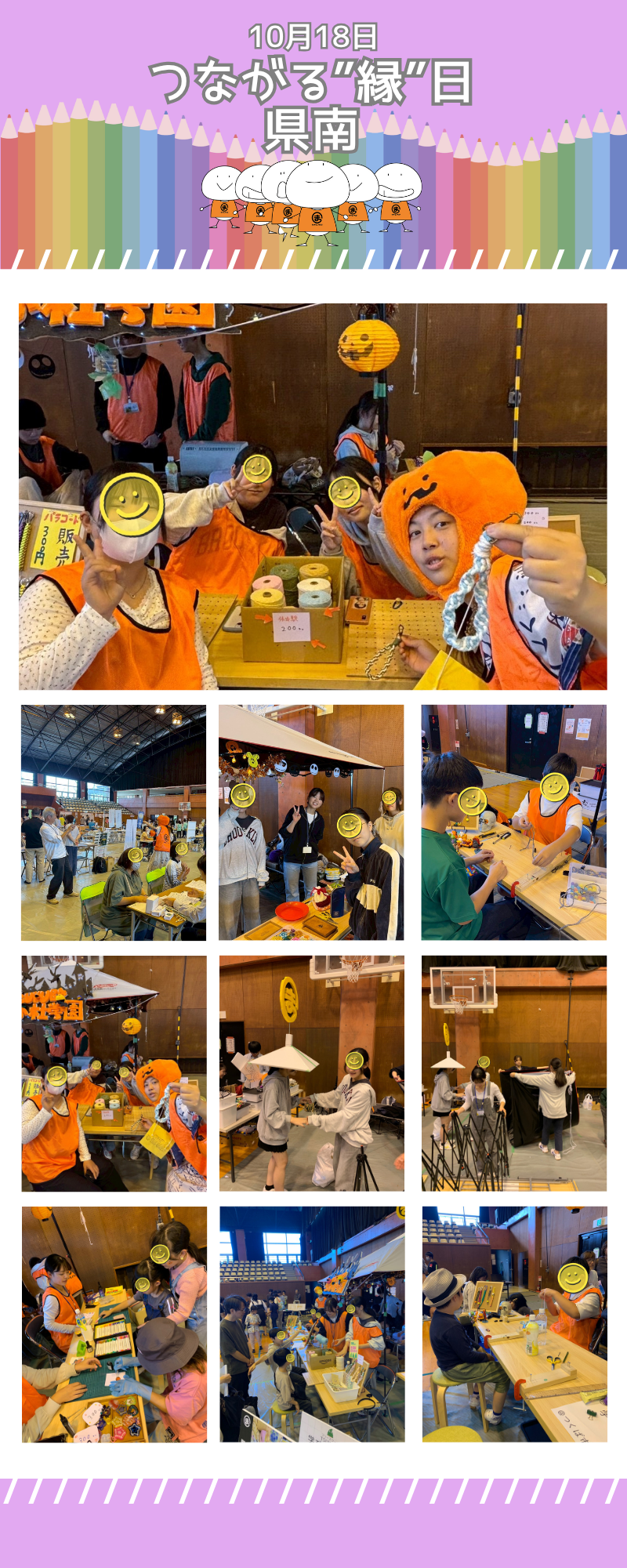 10月18日(土)つながる縁日県南が桜総合体育館にて開催されました。生徒たちのワークショップ模擬店で参加。生徒それぞれが役割を持ち、お互いをフォローしながらの運営です。各ワークショップにはお客さんが途切れることなく来ていただき、生徒たちも大忙し。楽しく頑張っている様子を多くの方々にご覧になっていただけたと思います。※つながる縁日について詳しくはこちらをご覧ください。