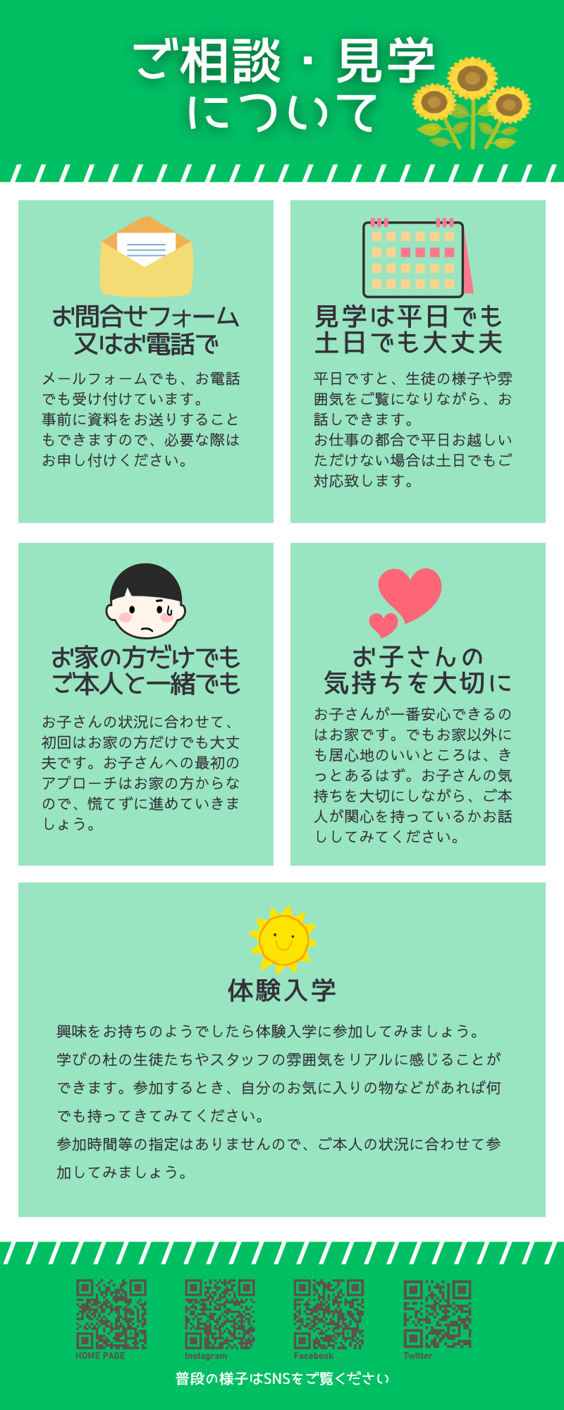 もうすぐ学校生活が再開。その前にご相談や見学をご希望の際は、ご連絡ください。ご案内させていただいている時間は以下の通りとなりますが、ご希望に応じて変更できますのでご安心ください。 午前の部11:00~ 午後の部13:00~ *所要時間は概ね1時間程度となります。